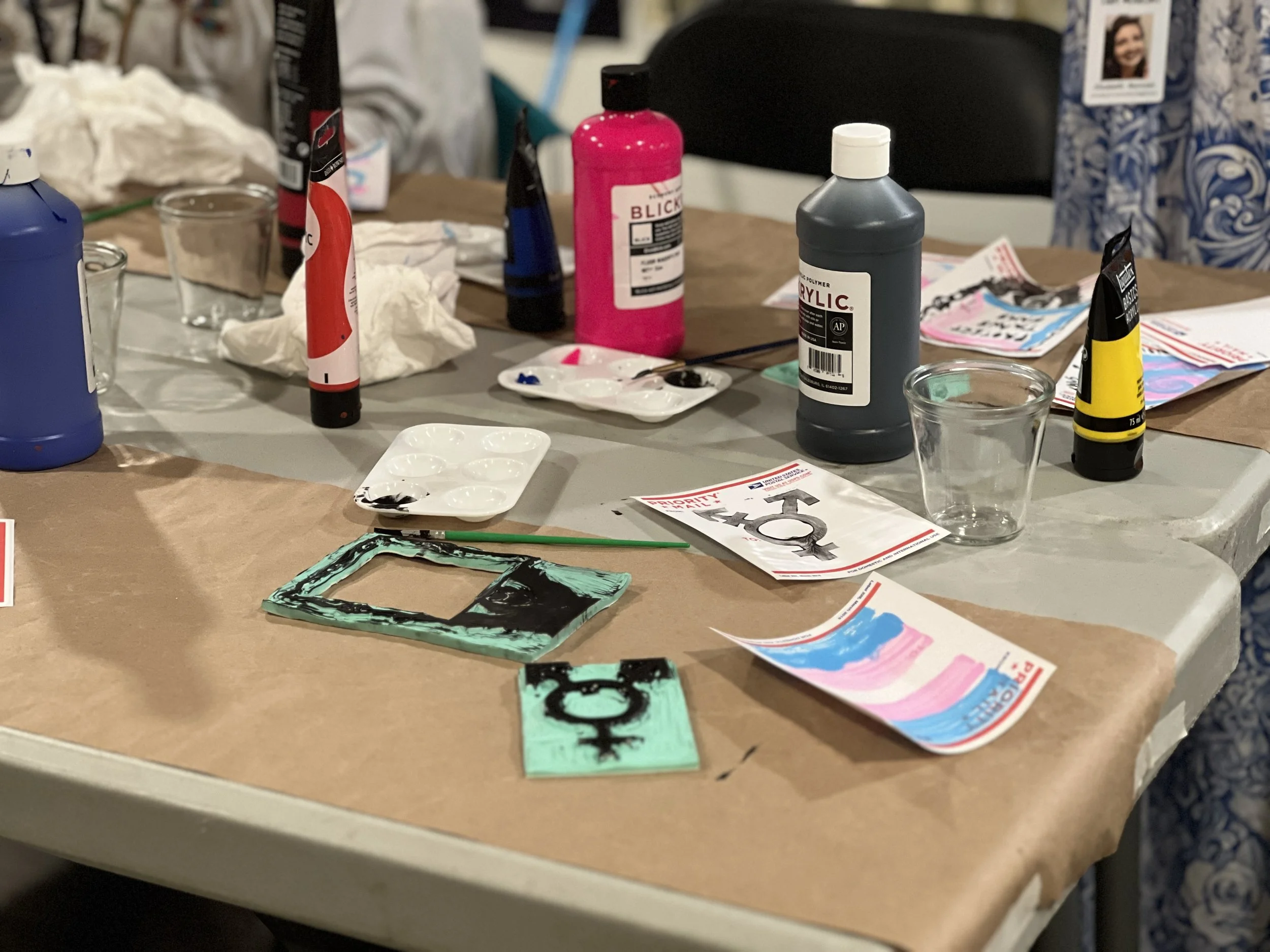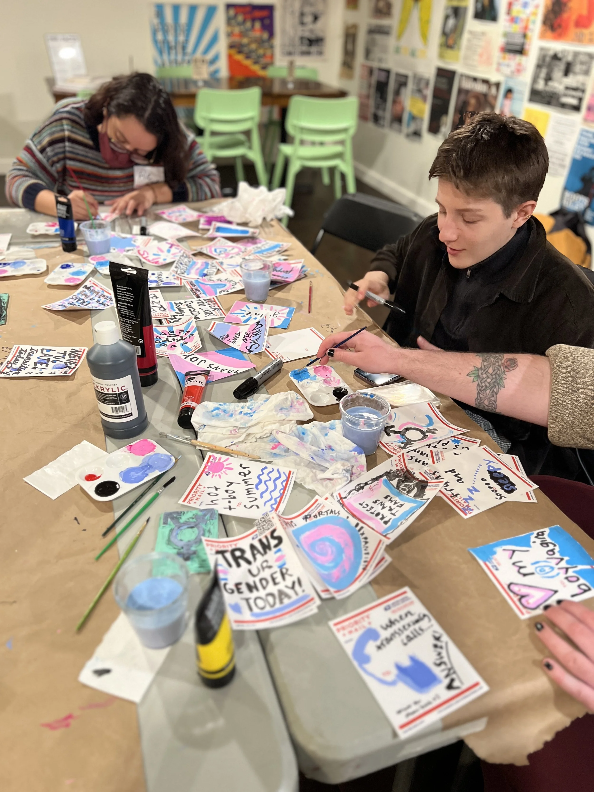 Supplies were provided, including sharpies, acrylic paint, and pre-carved rubber stamps. Events were free and open to people of all ages and identities. Data sheets with facts and statistics relating to trans identities were provided.