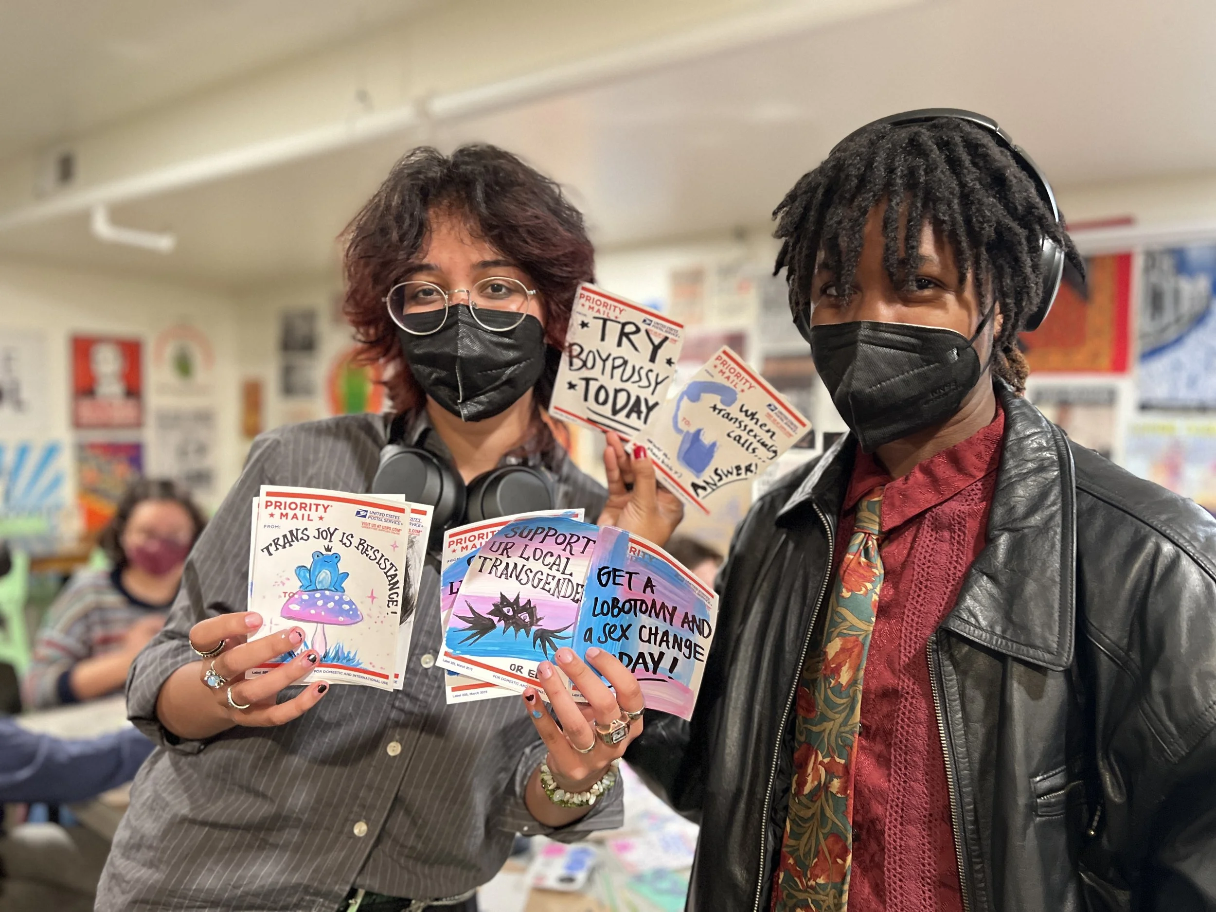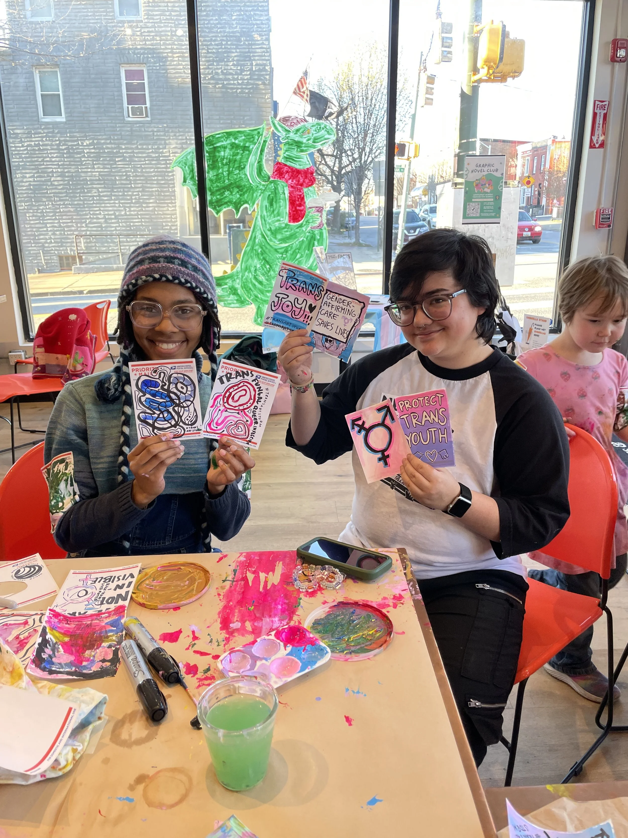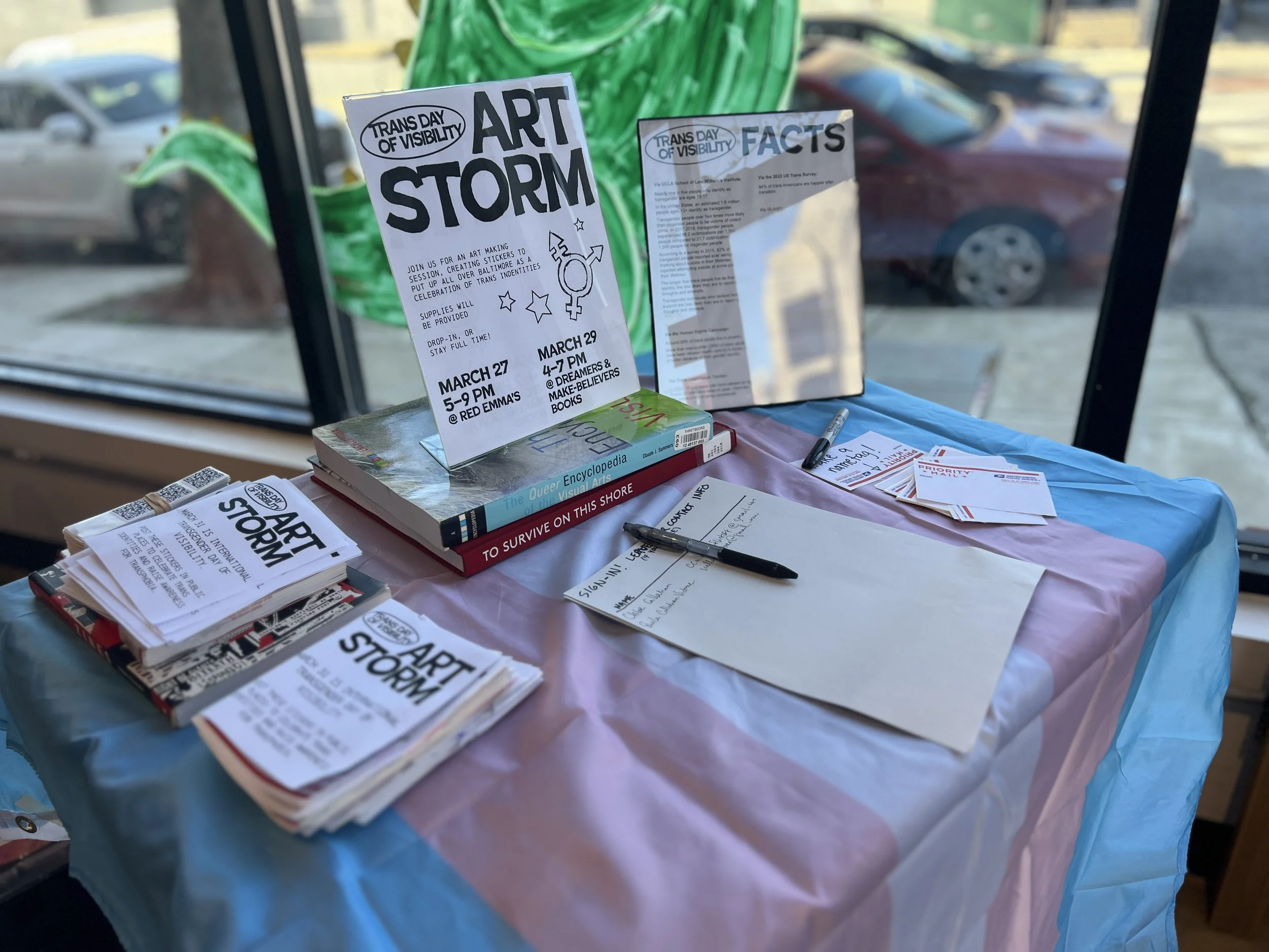In the spirit of International Transgender Day of Visibility, two artmaking events were held where participants could stop by to make graffiti sticker-slaps. Events took place at Queer-Friendly public spaces: Red Emma’s and Dreamers & Make-Believers Books.